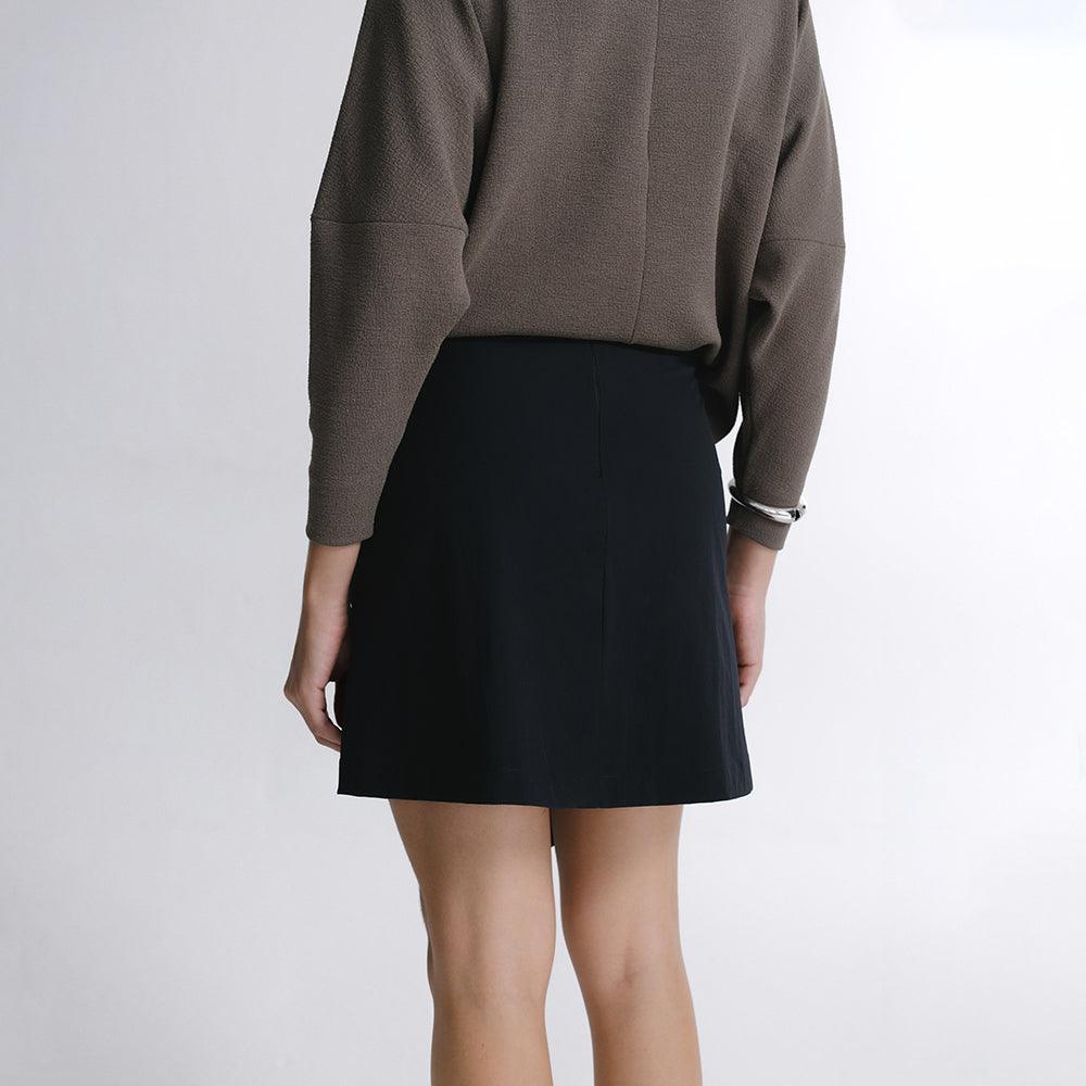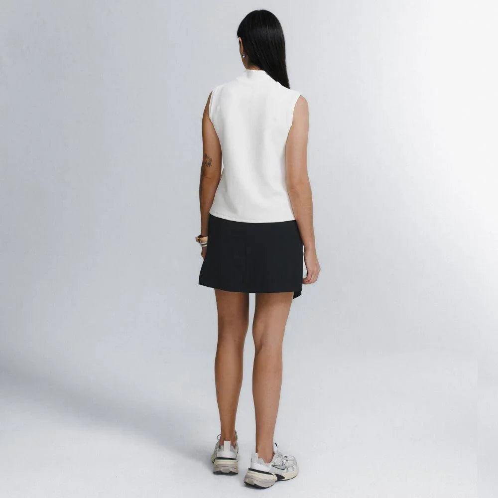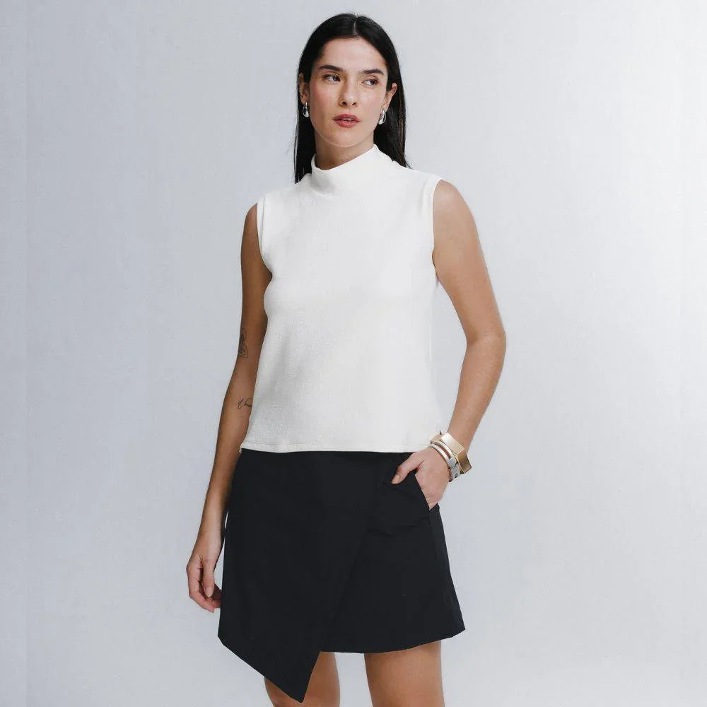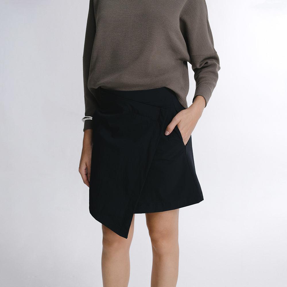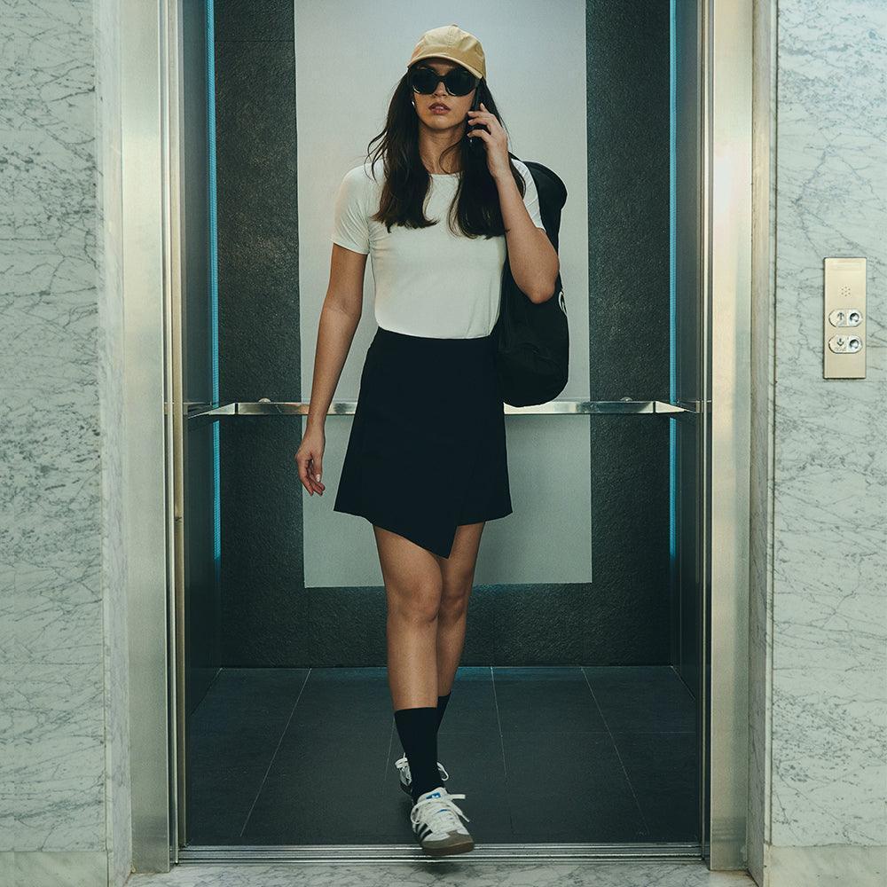 A Saia Mini Alfaiataria Tech Kyoto é uma das 2 novas adições à família Kyoto - alfaiataria tecnológica que une o minimalismo japonês ao design contemporâneo e recortes geométricos, para criar looks criativos e versáteis. Tem dois bolsos laterais, cintura alta, frente transpassada com fechamento invisível na diagonal do cós, e todas as funcionalidades do tecido tecnológico FutureForm®: